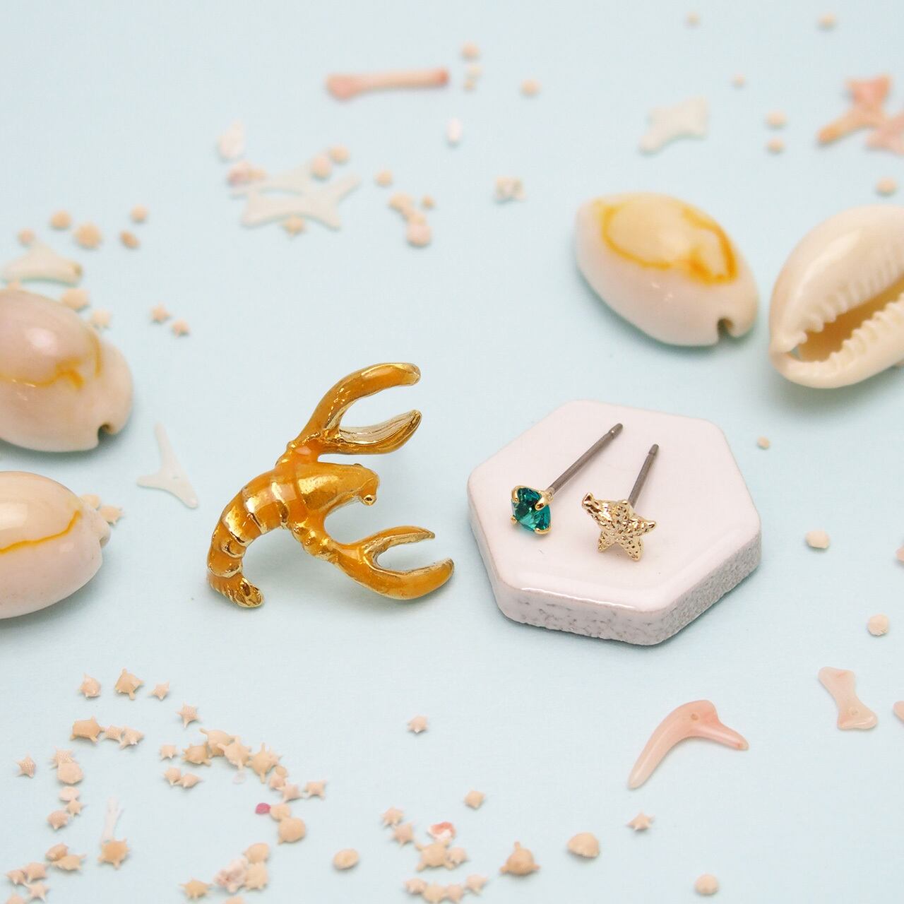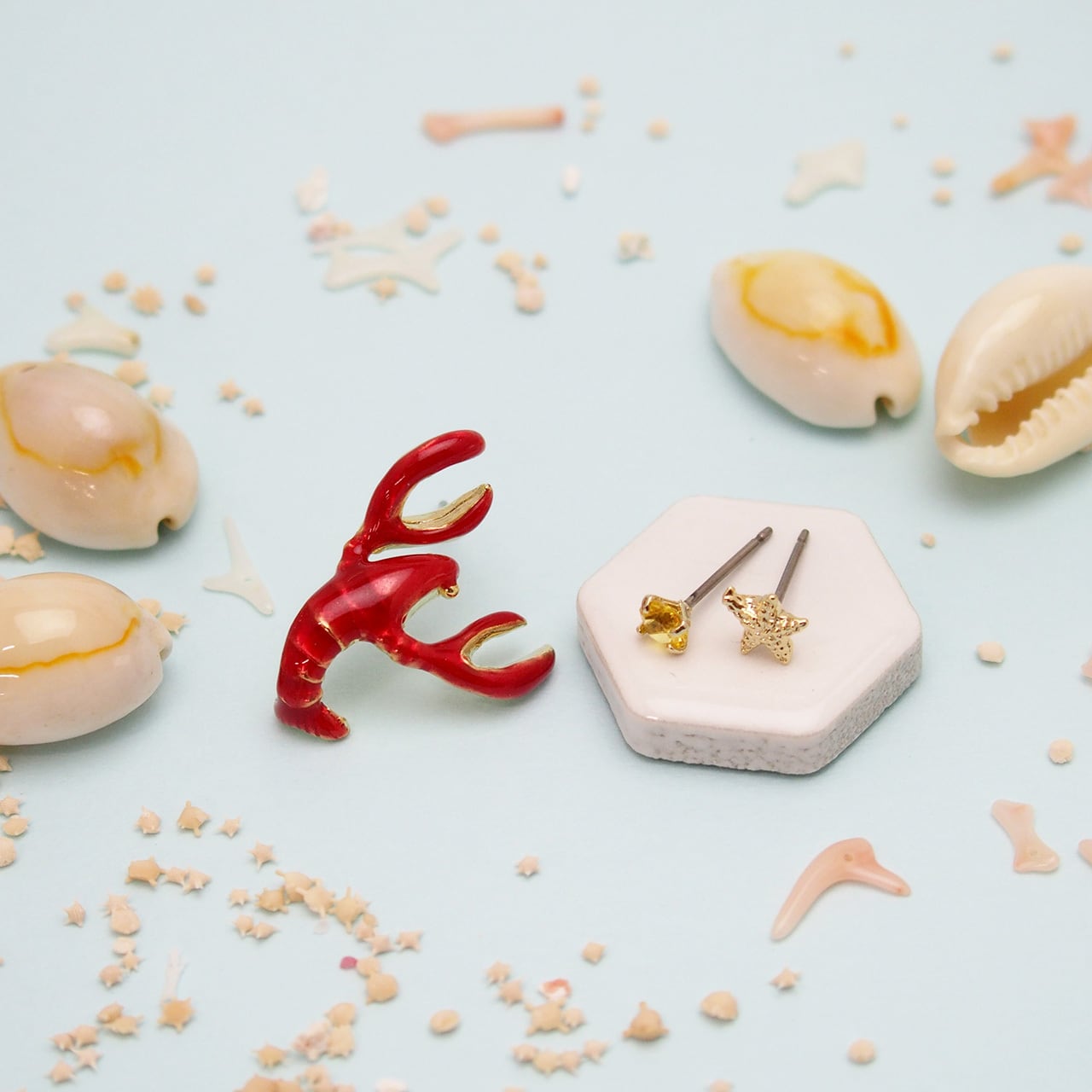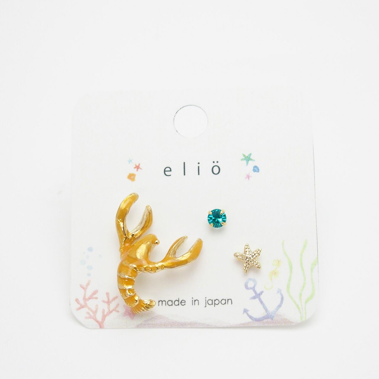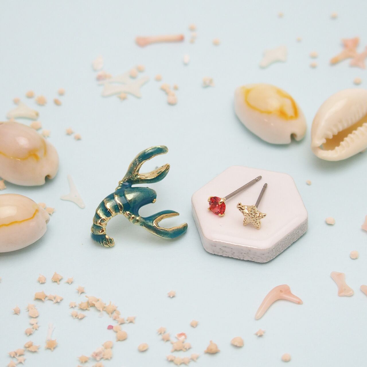 ロブスターをモチーフにした、ユニークなセットピアスです。
